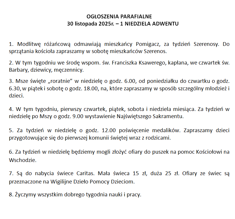 OGŁOSZENIA PARAFIALNE 30 listopada 2025r.